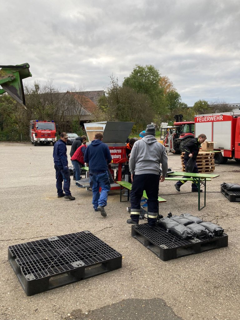 16 Kamerad*innen aus Adelsried und Bonstetten trafen sich in Bonstetten, um gemeinsam Sandsäcke 1000 Sandsäcke zu füllen. Beide Gemeinden hatten diese aufgrund der Starkregenereignisse der letzten Zeit als Vorsorge für den Bevölkerungsschutz angeschafft.
