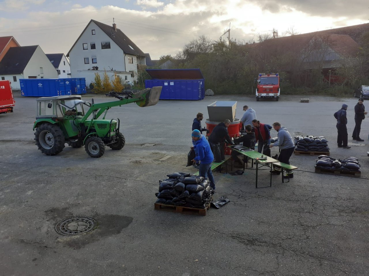 Dank dem tatkräftigen Einsatz der Beteiligten und einer Maschine des Landkreises Augsburg konnten die Säcke in nur 3 Stunden abgefüllt werden. Zur Stärkung wurden die Sandsackfüller*innen von der Gemeinde mit Schnitzelsemmeln verpflegt.