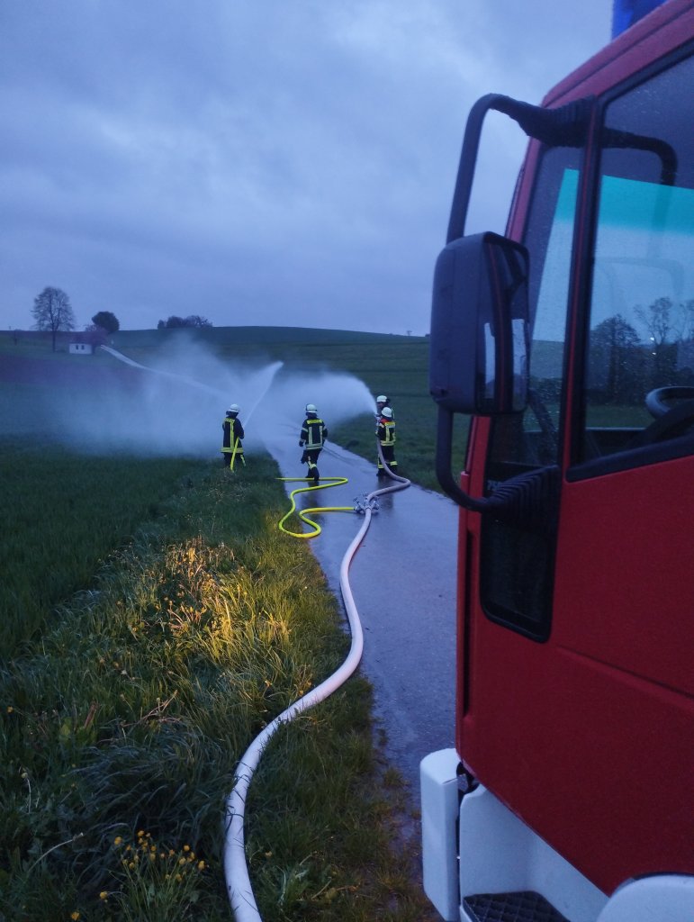 Wir bedanken uns bei der FF Adelsried für die Unterstützung mittels Faltbehälter und Tanklöschfahrzeug sowie Matthias Stegherr und Stephan Deil für die Unterstützung bei der Wasserzulieferung mittels Traktor und Güllefass.
